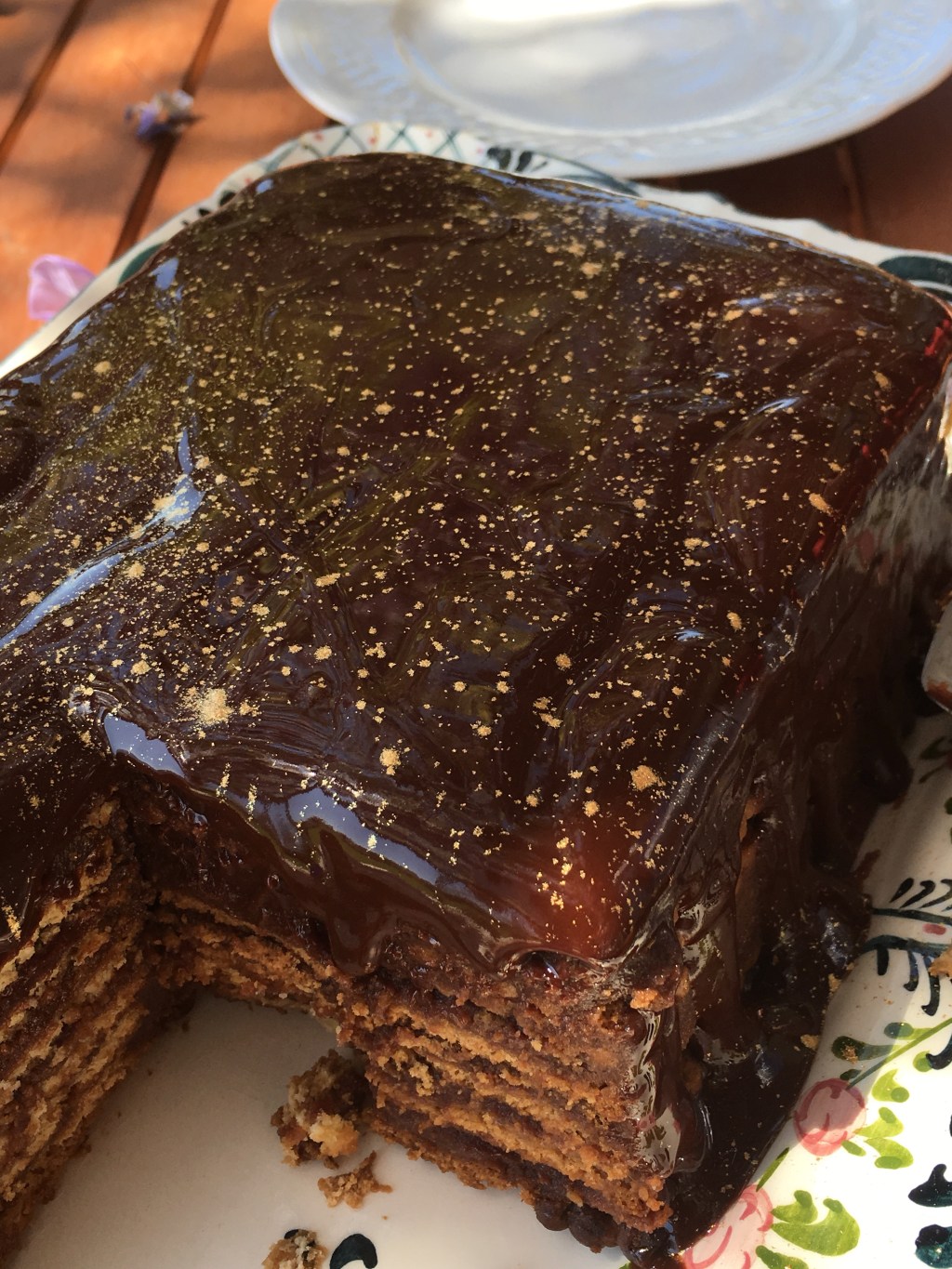 Le lendemain préparer le glaçage en faisant fondre à feu doux le chocolat et le beurre puis laisser refroidir. Sortir le gateau du frigidaire, retirer le film plastique sur le dessus, retourner le gateau dans le plat de service et retirer le film plastique du dessous. Puis faire couler le glaçage sur le gateau et servir.