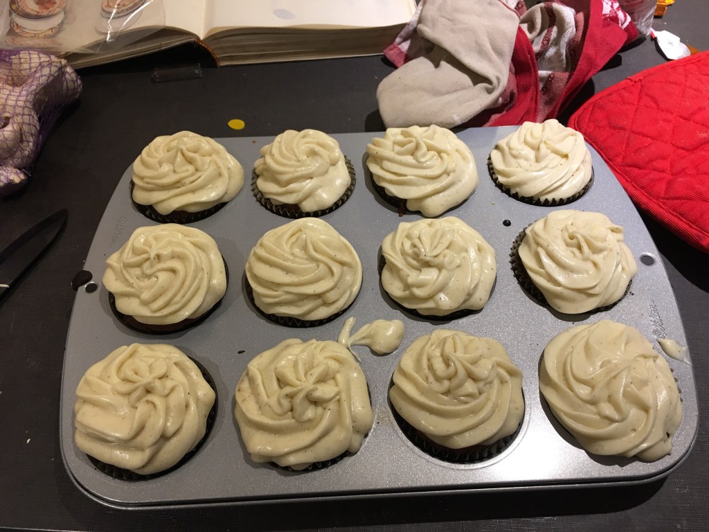 Mettre le glacage dans la poche à douille et en garnir chaque cupcake, attention à ne pas en mettre trop, il est très sucré!