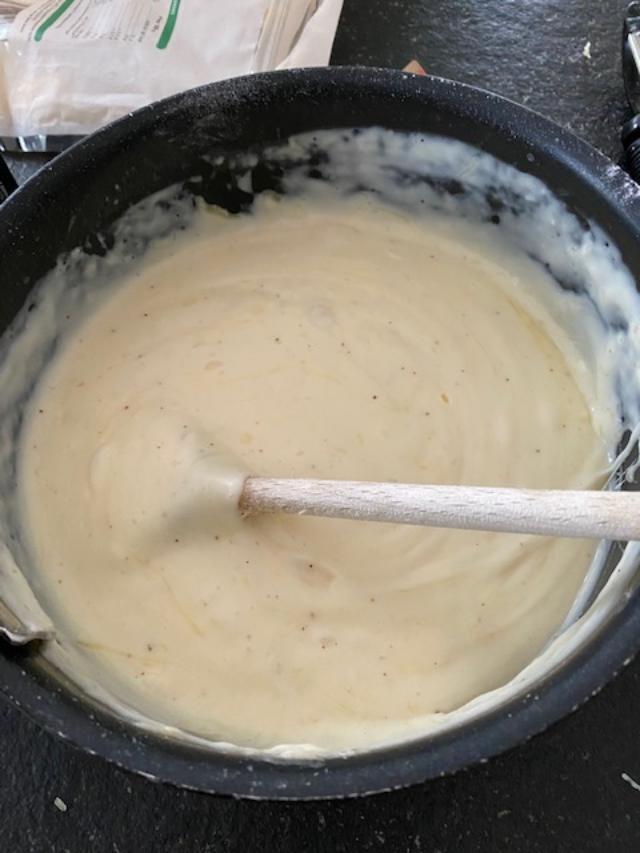 Puis préparer la béchamel. Mettre à fondre le beurre dans une casserole à feu moyen, lorsque le beurre est fondu ajouter la farine pour former une pate en tournant avec la cuillère en bois. Quand la pate est épaisse ajouter un peu de lait et tourner vigoureusement avec la cuillère jusqu’à ce que la pate se reforme. Répéter l’opération jusqu’à l’utilisation de tout le lait. S’il y a des grumeaux, battre la préparation au fouet. Ajouter une bonne pincée de sel, du poivre et une pincée de noix de muscade. Une fois que la béchamel est prête, la retirer du feu et ajouter 100 grs de gruyère rapé. Mélanger puis laisser reposer.